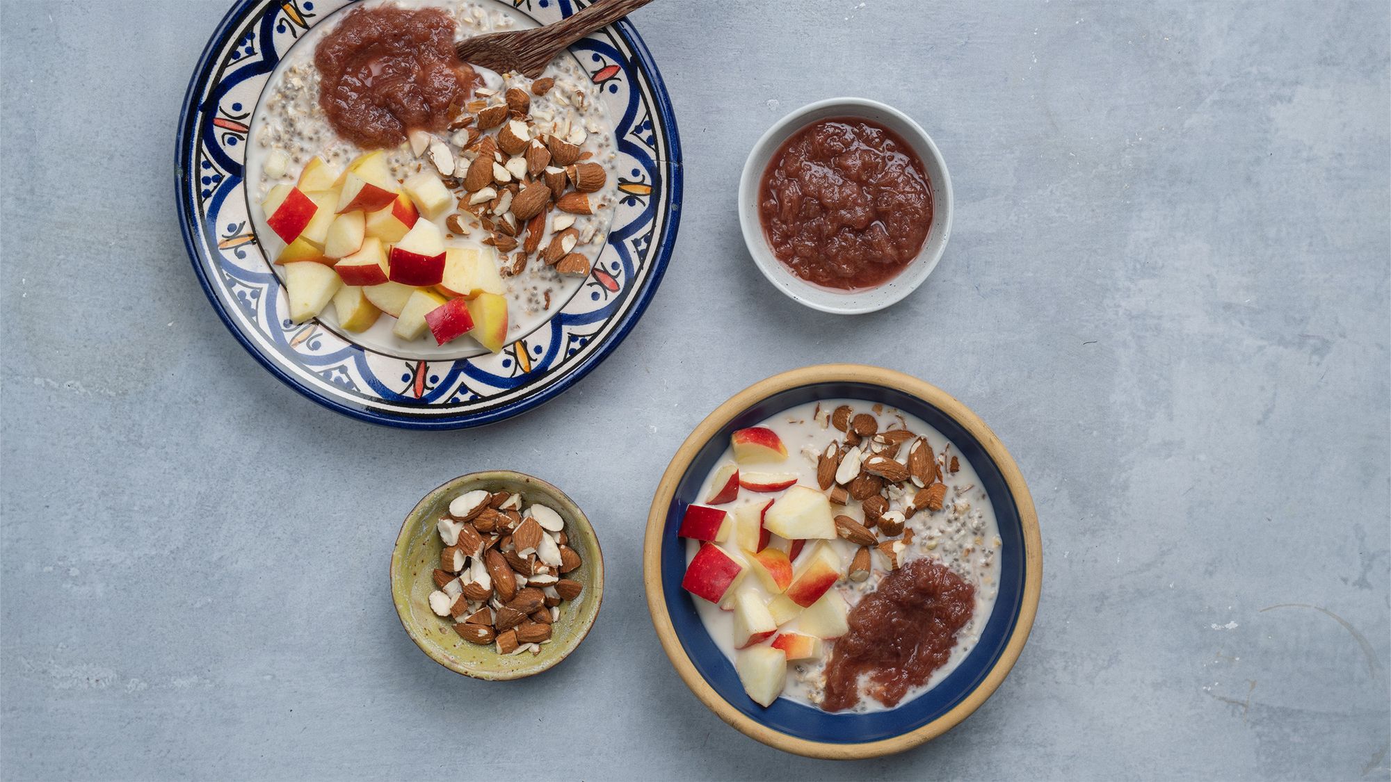 Overnight oats med rabarberkompot, æble og ristede mandler