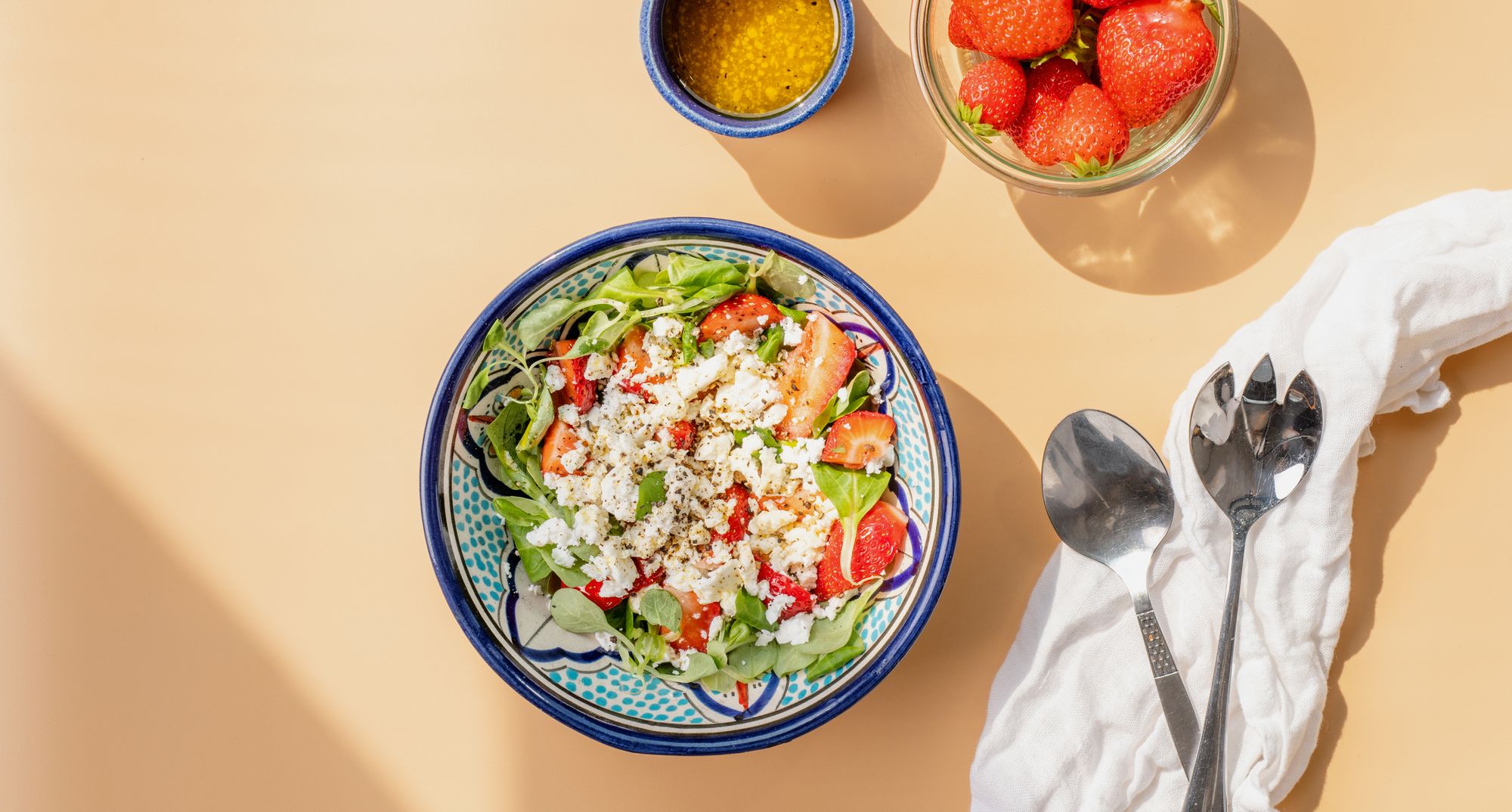 Skyl feldsalat og kom i en skål. Skyl jordbær og snit i grove både.